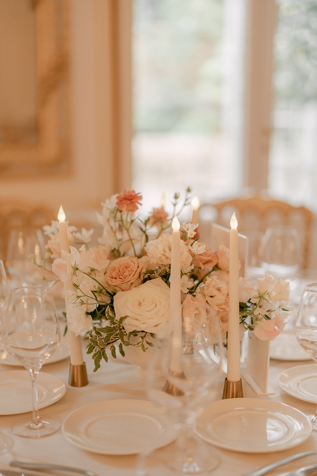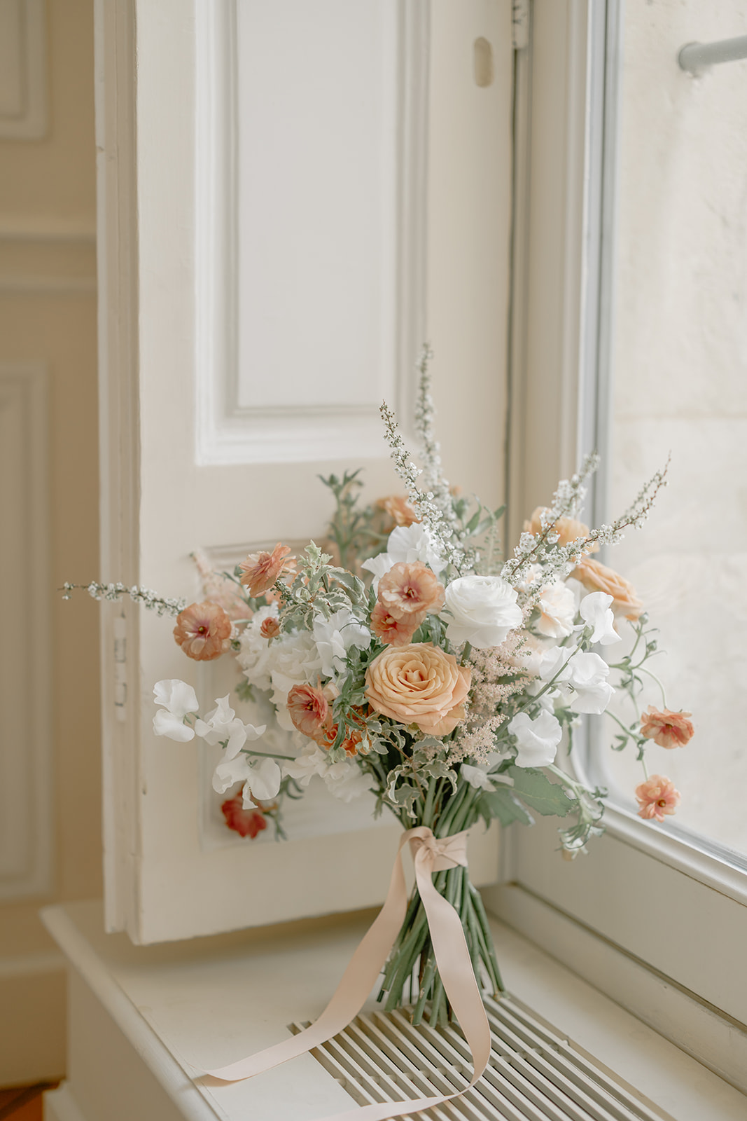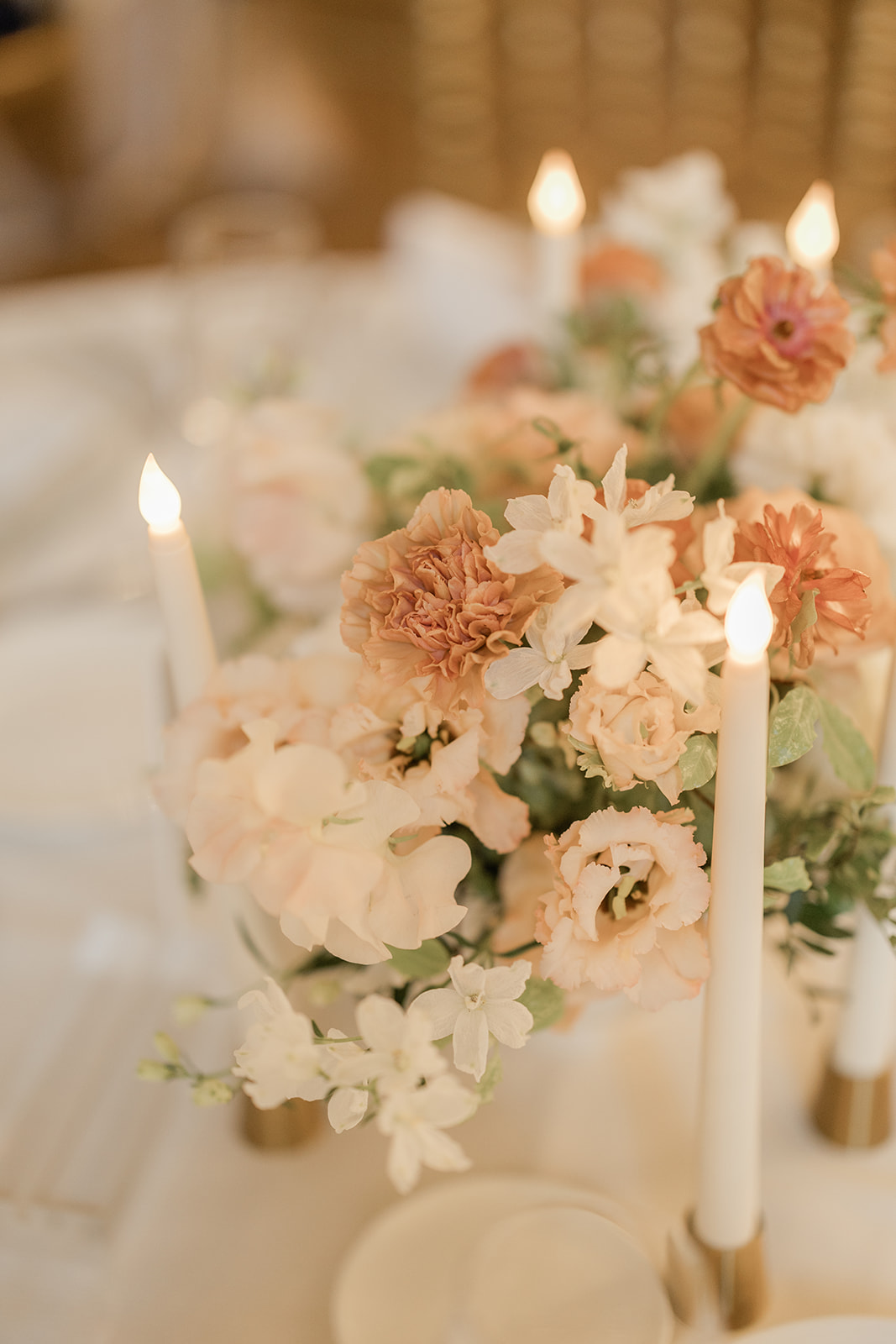 Pour les tables invités, nous avons imaginé des compositions basses mais volumineuses, afin de conserver l’élégance du lieu et la fluidité des échanges. Les fleurs se répondaient dans des dégradés pêche, blancs et terracotta poudrés.