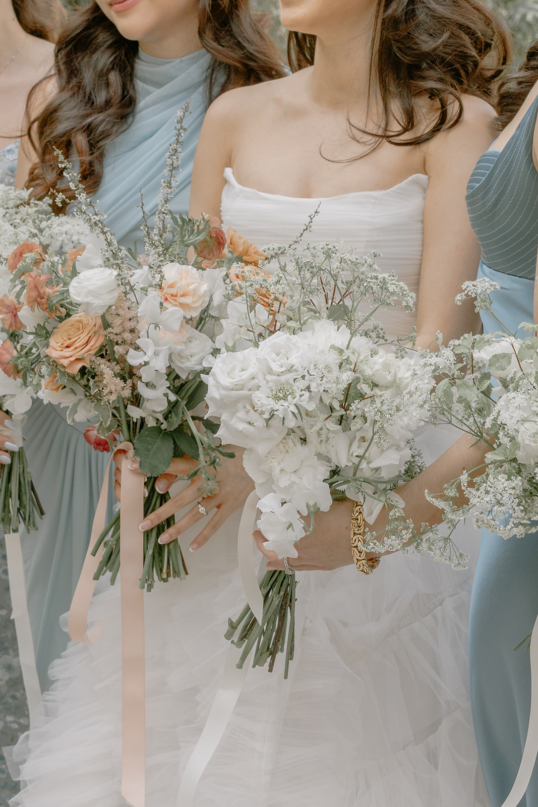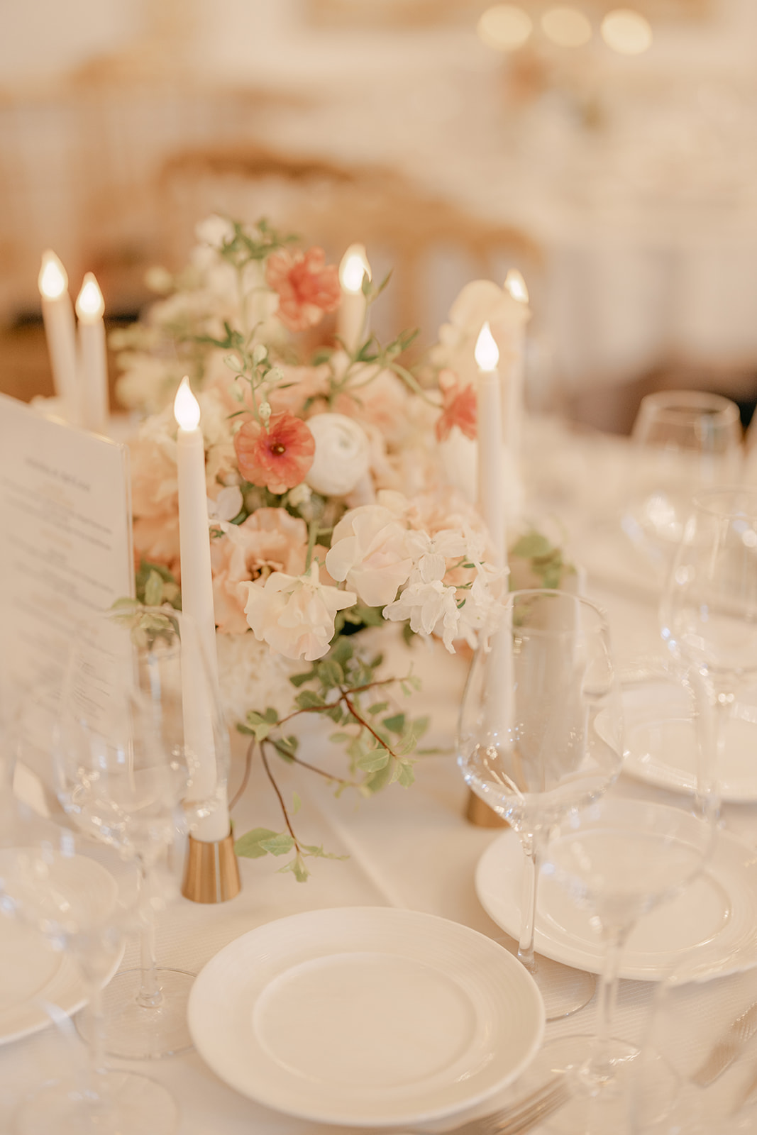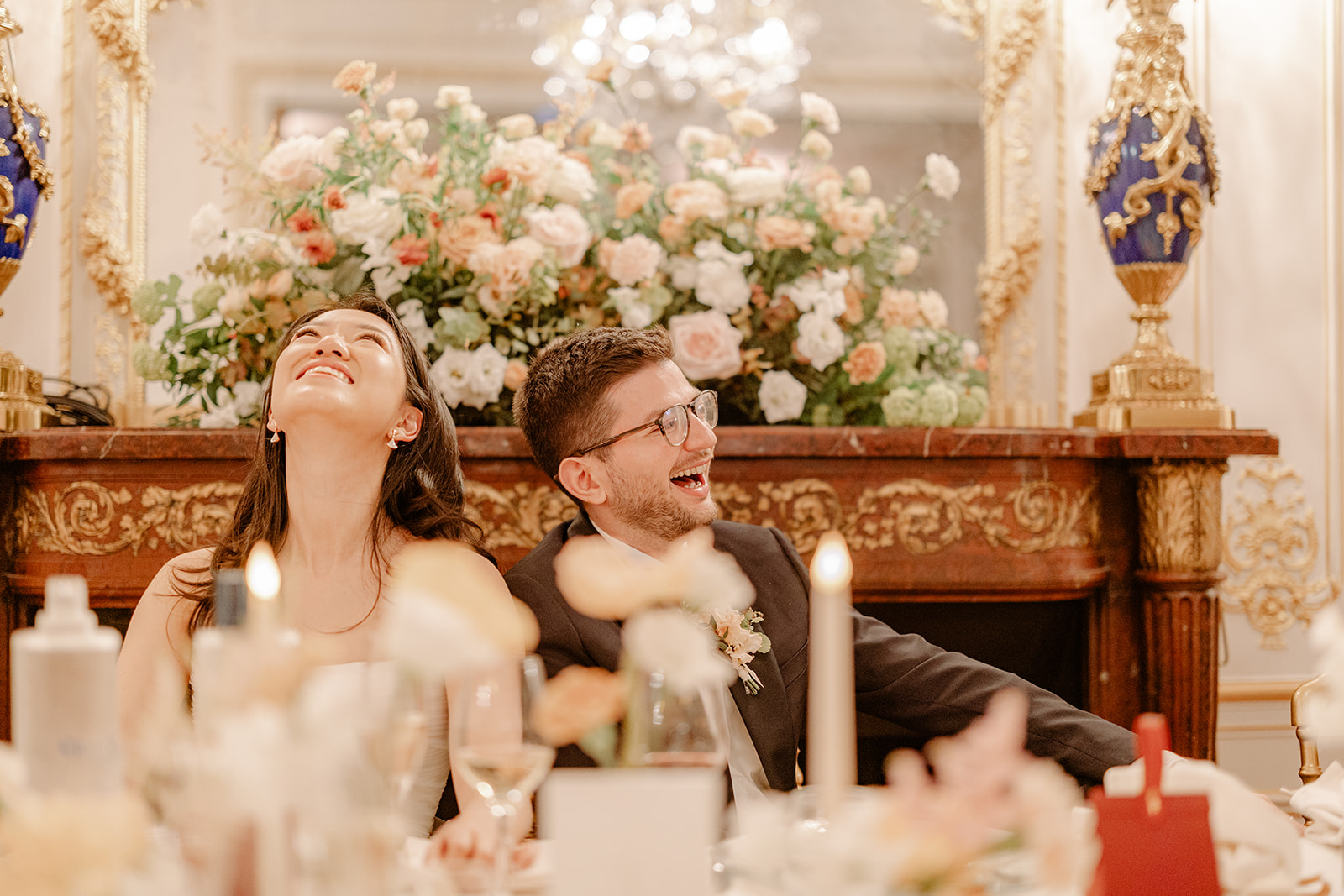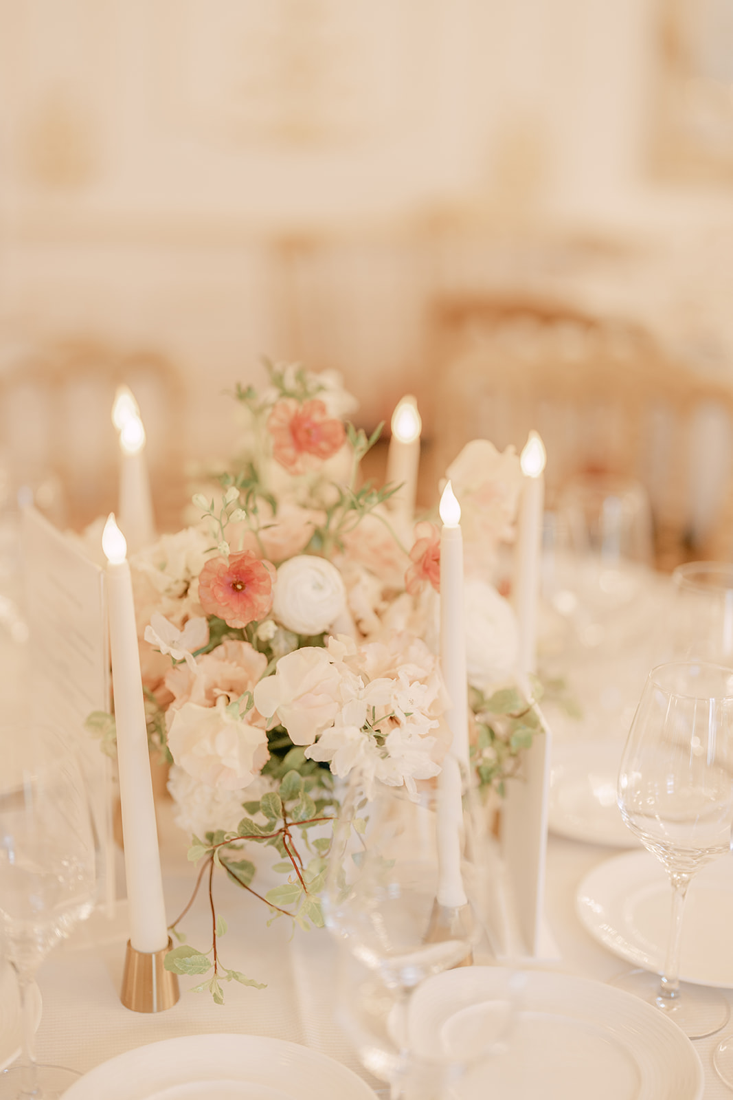 Sur la table des mariés, une accumulation de fleurs délicates a été installée dans toute la longueur, créant une ligne florale généreuse et immersive. L’ensemble composait un décor dansant, tout en finesse, parfait pour un dîner chic et romantique.