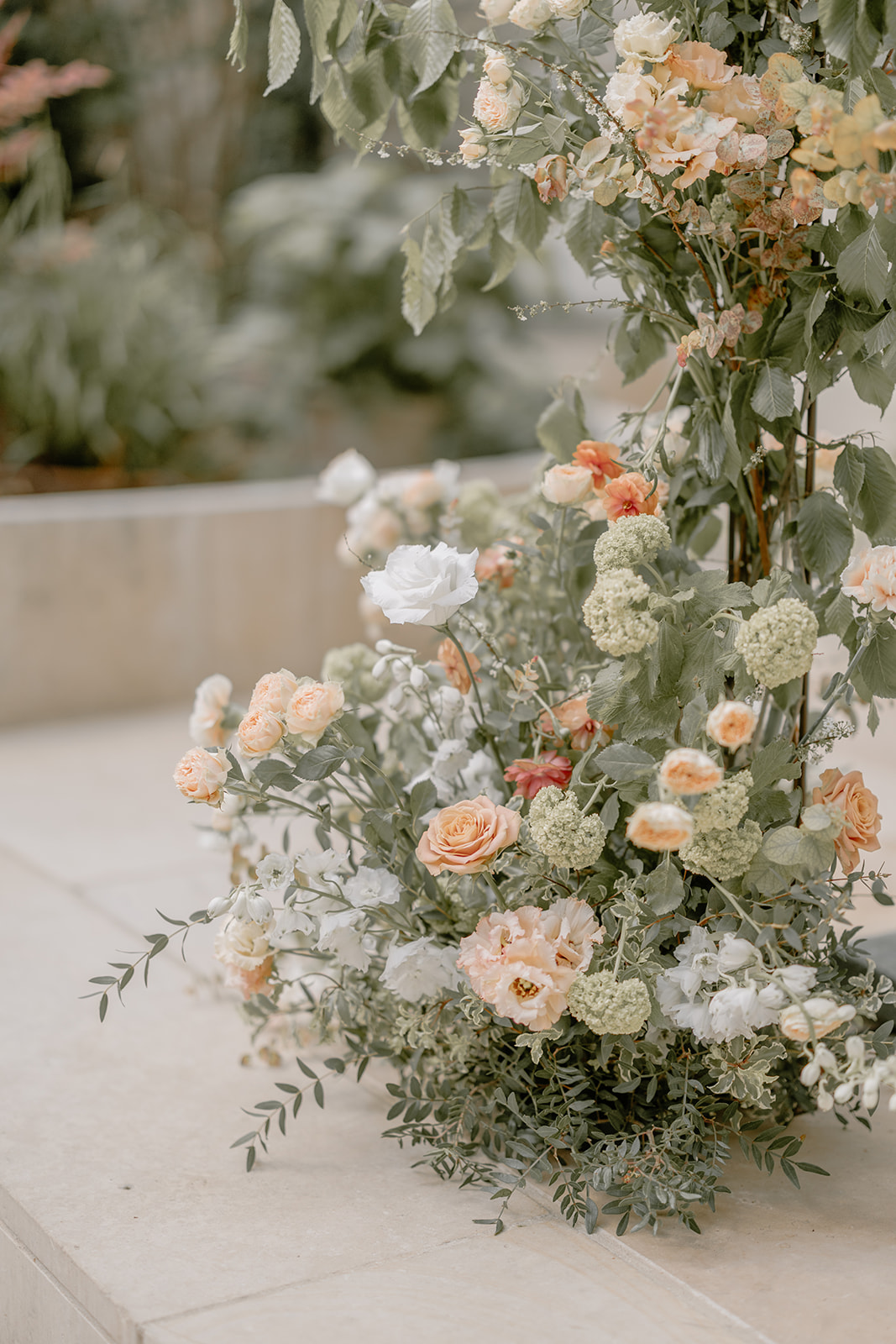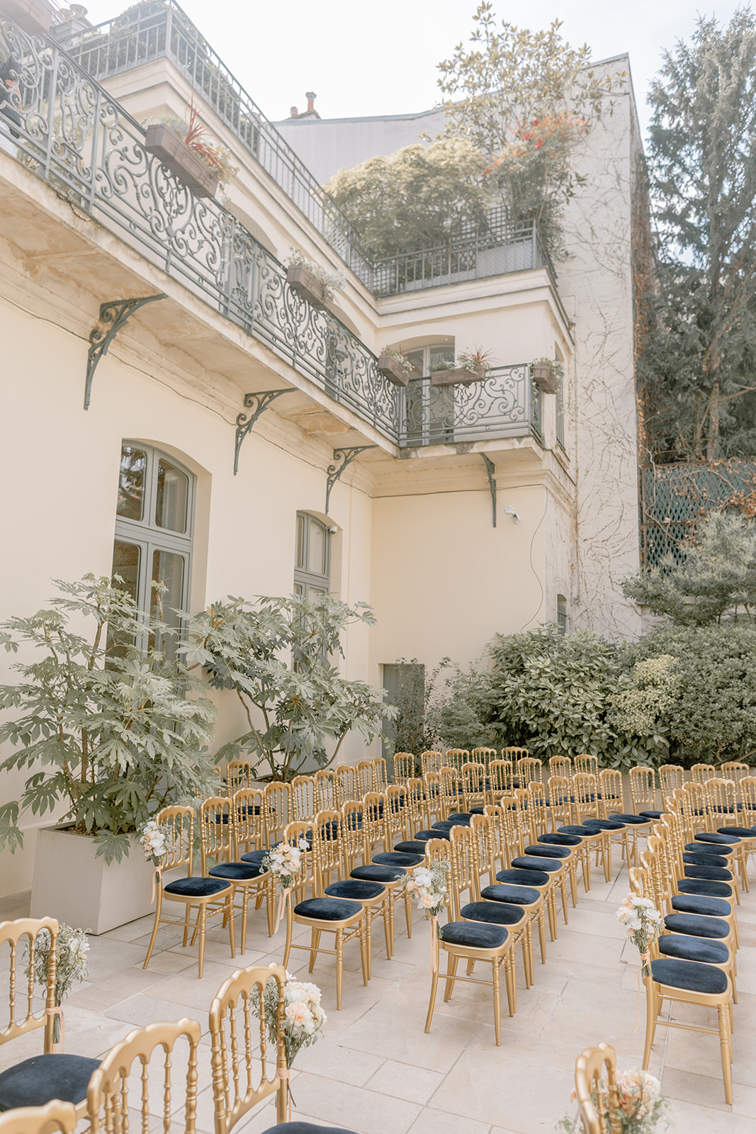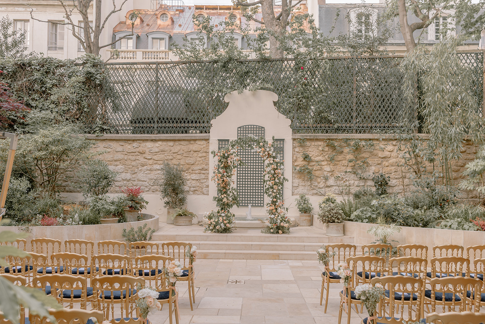Pour la cérémonie, une arche en fer forgé a été installée dans la cour de l’hôtel. Nous l’avons travaillée comme un véritable jardin en fleurs, avec un effet organique, vivant, presque comme si la nature reprenait sa place au cœur de Paris.